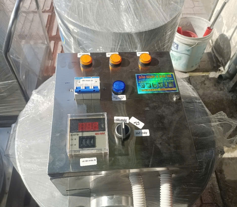 Nồi 200L thường sử dụng điện 3 pha với công suất lớn (khoảng 12KW - 15KW). Bảo Phát không gắn điện dưới mâm nồi mà trang bị Tủ điện điều khiển rời gắn tường: