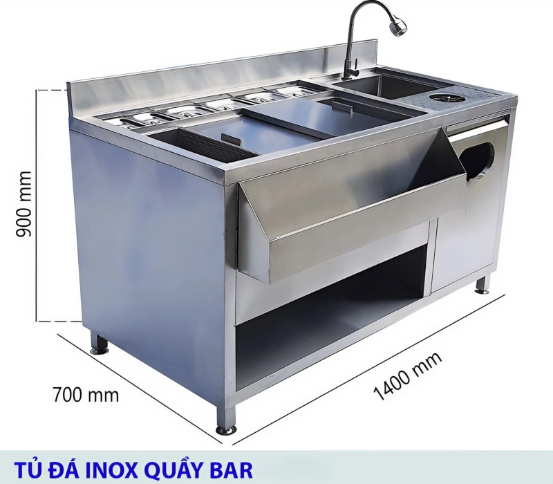 - Tuyệt đối không ẩm mốc, mối mọt: Môi trường pha chế luôn ẩm ướt. Inox 304 cao cấp có khả năng chống nước và chống gỉ sét 100%, đảm bảo quầy luôn bền bỉ bất chấp thời gian, không bao giờ xảy ra tình trạng mục nát như quầy gỗ.