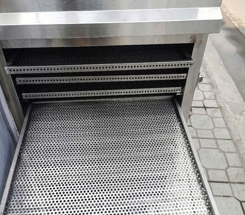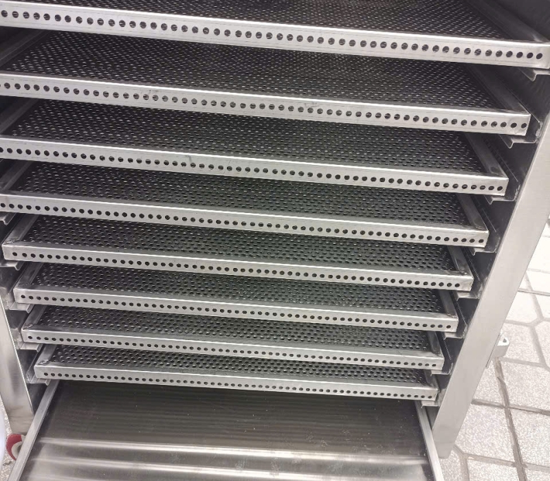 Khay sấy được thiết kế dạng đục lỗ tinh tế, giúp hơi nóng lưu thông dễ dàng từ dưới lên trên và xuyên qua các lớp thực phẩm. Kích thước khay rộng rãi, cho phép sấy được lượng lớn nguyên liệu trong một lần (trung bình 1.5 - 3kg/khay tùy loại).